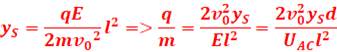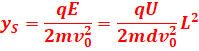 Lorsque la particule est au point de sortie S, son abscisse est : x=L. La durée t1 de passage entre les plaques est alors donnée par : x=L=v0t1 ; la déviation parabolique de la particule a lieu pendant la durée t1=L/v0