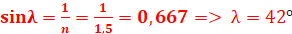 sini=nsinr =>sinr=sini/n=1/1,5=0,667 => r=42° //ici r= λ, angle limite de réfraction.