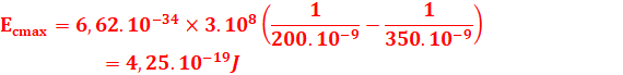 Ec=2,1-1,87=0.23eV=0.23 eV soit 0,23x1,6.10-19= 0,368.10-19J