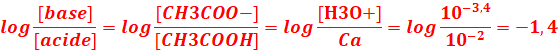 pH=pKA + log [Base]/[Acide] =>pKA=pH- log [Base]/[Acide]=3,4+1,4 = 4,8