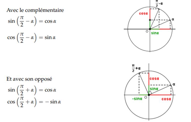 Relation avec l’angle complémentaire et l’opposé du complémentaire