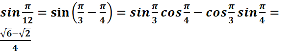 cos(π/12)=cos(π/3 - π/4)=cosπ/3cosπ/4 + sinπ/3sinπ/4=1/2xѴ2/2 +Ѵ3/2xѴ2/2=(Ѵ2+Ѵ6)/4.