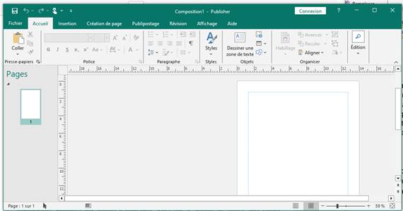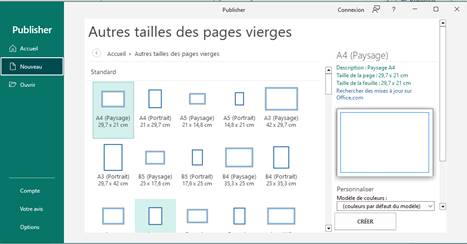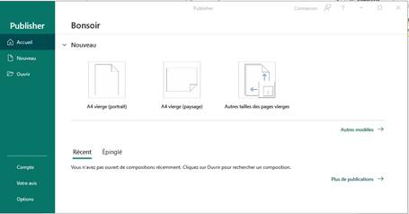 Au démarrage, Publisher vous propose une fenêtre contenant dans le menu Accueil des modèles des tailles de pages vierges dans différents formats.