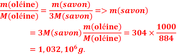 molaires : de l’oléine :884g/mol ; de l’oléate de sodium :304