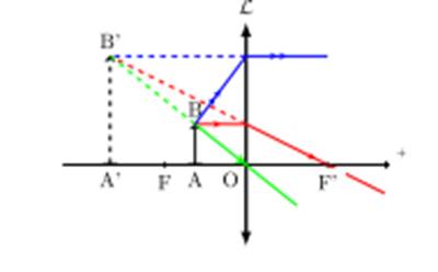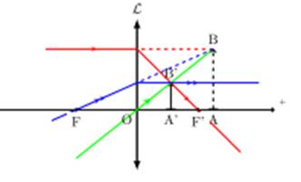 1-Sur le schéma ci-dessous, A'B' est l'image d'un objet AB obtenue à travers une lentille mince convergente. Donner les propriétés des 3 rayons ayant permis de construire l'image A'B', puis décrire l'image A'B'.