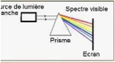 Un prisme par exemple décompose la lumière blanche (lumière solaire) en sept radiations monochromatiques. L’ensemble de ces radiations observées sur un écran constitue le spectre de la lumière blanche. On obtient les sept couleurs de l’arc-en-ciel : le rouge, l’orangé, le jaune, le vert, le bleu, l’indigo et le violet par ordre de déviation croissante.