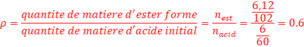 on a obtenu 10,2 g d’ester et que le rendement de la réaction est de 60%.