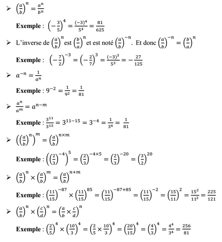Soienta, b, m et n quatre nombres entiers naturels non nuls. Pour calculer une puissance d’un nombre rationnel d’exposant entier relatif, on utilise les propriétés suivantes :