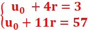 u14=u0 +14r =>u8+u10+u12+u14= u0 +8r+ u0 +10r+ u0 +12r+ u0 +14r=4u0+44r =>u0+11r=57