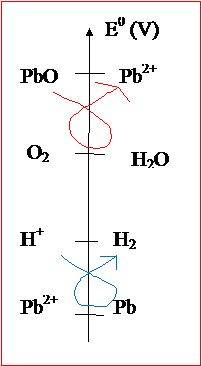 On remarque que l’électrode recouverte de PbO2 peut réagir avec l’eau (gamma rouge), et que celle en plomb peut réagir avec les ions H+ de l’acide sulfurique (gamma bleu).
