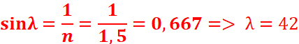 sini=nsinr =>sinr=sini/n=1/1,5=0,667 => r=42° //ici r= λ, angle limite de réfraction.