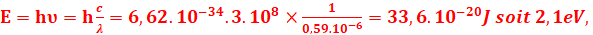 Ec=2,1-1,87=0.23eV=0.23 eV soit 0,23x1,6.10-19= 0,368.10-19J