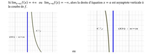 Lorsque la fonction f(x) tend vers l’infini quand x tend vers a, la droite d’équation x=a est asymptote verticale.