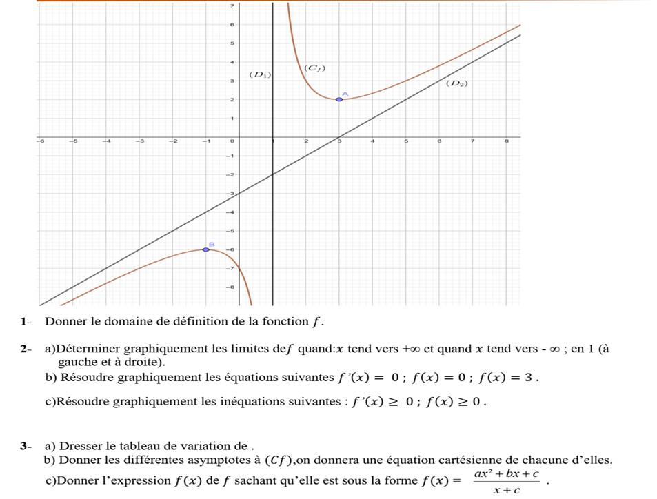 On considère la courbe (C) de la fonction f donnée ci-contre. En s’inspirant de ce graphique, répondre aux questions suivantes: