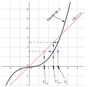 · A partir du point d’abscisse u0 sur l’axe des abscisses, on obtient sur l’axe le point d’abscisse u1 en traçant une parallèle à l’axe des ordonnées qui coupe la courbe au point A0(u0, u1), on trace ensuite une parallèle à l’axe des abscisses qui passe par A0; cette parallèle coupe la première bissectrice en un autre point. En traçant une autre parallèle à l’axe des ordonnées passant par ce point, cette nouvelle parallèle coupe l’axe des abscisses au point u1.
