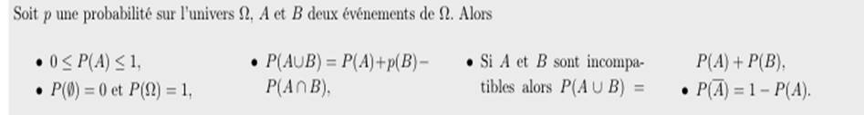 Soit p une probabilité sur l’univers Ω , A et B deux événements de Ω. Alors:
