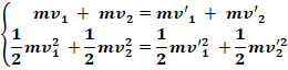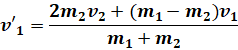 Lors du choc élastique de deux corps on a les données suivantes : m1 = 20 g ; v1 = 160 m/s ; m2 = 30 g. Le deuxième corps est au repos avant le choc, calculons les vitesses finales v’1 et v’2 des 2 corps en supposant quelles sont colinéaires.