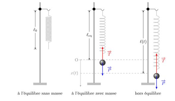 Lorsqu’on ecarte la masse de sa position d’equilibre, la tension du ressort a un instant donnee est differente de sa valeur a l’equilibre :