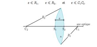 Si l’on note R1 ; R2 les rayons de courbure des deux dioptres, C1; C2 leurs centres respectifs et e l’épaisseur de la lentille, alors
