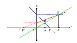-tout rayon incident qui passe par le foyer principal objet émerge de la lentille parallèlement à l’axe principal (rayon de couleur bleue sur le schéma).