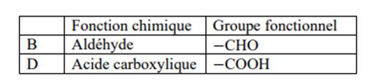Donne la fonction chimique et le groupe fonctionnel de B et D