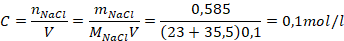 MNaCl=23+35,5=58.5 g/mol V=0,2 l